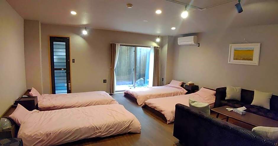 The twin room provides air conditioning, tatami, as well as a shared bathroom featuring a shower and a bidet. The twin room offers a tea and coffee maker. The unit offers 2 futons.